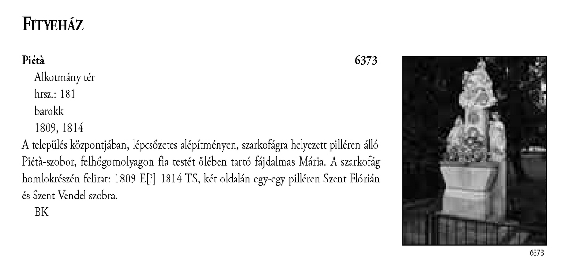Nyilvános 2218 | 6496 | Fityeház - Magyarország műemlékjegyzéke - Zala megye 2006 027old | A részlet szövege: FITYEHÁZ Piétà 6373 Alkotmány tér hrsz.: 181 barokk 1809, 1814 A település központjában, lépcsőzetes alépítményen, szarkofágra helyezett pilléren álló Piétà-szobor, felhőgomolyagon fia testét ölében tartó fájdalmas Mária. A szarkofág homlokrészén felirat: 1809 E[?] 1814 TS, két oldalán egy-egy pilléren Szent Flórián és Szent Vendel szobra. BK A részlet a következő könyv online változatából származik: Cím: Magyarország műemlékjegyzéke Közreműködő: Haris Andrea. (szerk.) ; Kulturális Örökségvédelmi Hivatal (Budapest) (közread.) ; Somorjay Sélysette. (szerk.) ; Bardoly István (közrem.) Szerz. közl.: [sorozatszerk. Haris Andrea, Somorjay Sélysette] ; [mtárs Bardoly István] ; [közread. a] Kulturális Örökségvédelmi Hivatal. Kiadás: Budapest : KÖH, 2006 Kötetadat: Zala megye ISBN: 963-86510-7-5 ö ISBN: 963 7474 10 2 Nyelv: magyar A jegyzék a Kultúrális Örökségvédelmi Hivatal honlapján, a következő link alatt található: http://www.koh.hu/index.php?_mp=nyitolap&_amp=MUEML A fejléc adatairól 1. Objektum neve – törzsszám A fejléc első sora a műemlék eredeti rendeltetésének megfelelő nevet tartalmazza. Mögötte zárójelben templom esetében annak titulusa, más épületeknél indokolt esetben az eredeti rendeltetéstől eltérő, mai használatra utaló intézmény név (pl. városháza, múzeum, szálloda, oktatási intézmény hivatalos neve, stb.) olvasható. A törzsszám (trsz.) a műemlék egyetlen soha nem változó adata. A gyors azonosítás, illetve a törzsszám szerinti keresés lehetősége végett az objektummal egy sorban, a fejléc jobb szélén kiemelten jelenik meg. Összetartozó műemlék részek vagy történetileg egy együttest alkotó műemlékek sokszor külön törzsszámon lettek műemlékké nyilvánítva. Előfordulhat ezért, hogy egy fejléc alatt a leíró részben több, külön törzsszámmal rendelkező objektum szerepel. A törzsszámot ezekben az esetekben is az objektummal egy sorban tüntetjük fel. 2. Utca, házszám Egy utcán belül, amennyiben a számozás ezt lehetővé teszi, először a templomot adjuk meg, ezt követi a parókia, majd egyéb objektumok, pl. szobrok következnek. Házszám nélkül említünk egyes műemlékfajtákat (elsősorban templomokat), amennyiben a topográfiai azonosítás szempontjából a házszám közömbös vagy éppen zavaró. Előfordul, hogy a műemlék nem köthető nevesített közterülethez. Az ilyeneket a település végéhez soroltuk, és a leírásban kitértünk a településen belül elfoglalt helyükre. 3. Helyrajzi szám Ha egy helyrajzi számon és egy címen (pl. temetőben) több, külön törzsszámmal védett objektum van, akkor az együttesre utaló műemlék megnevezés alatt a közös adatokat egyszer adjuk meg. Ezt követően külön címszavanként következik a műemlékek leírása. Ilyen esetben az emlékeket mutatóztuk. Ezt az eljárást követtük, tekintet nélkül arra, hogy a teljes együttes védett-e vagy sem. (Védett együttes mellett mindig törzsszám szerepel.) Ha több helyrajzi szám is tartozik egy törzsszámhoz, akkor a fejlécben valamennyi számot feltüntettük. Amennyiben ilyen esetben több elemből álló műemlékről van szó, akkor a leíró részben minden külön említett elem után zárójelben megadjuk a vonatkozó helyrajzi számot. 4. Stílus A műemléket jelenleg meghatározó, domináns stílusjegy alapján került meghatározásra. Egyéb, érzékelhető stíluselemekre a leíró részben utalunk. 5. Datálás A műemléket jelenleg leginkább jellemző építési dátum. Korábbi építési periódusokra, illetve későbbi átépítésekre a történeti részben utalunk, fennmaradt részletek esetén lehetőség szerint azokra vonatkoztatva. A leírás A műemlékek leírása tartalmilag öt szakaszból áll, amely folyamatos szövegként jelenik meg. Az objektum topográfiai meghatározása a műemlék településen belüli vagy ahhoz viszonyított helyét adja meg, amennyiben ez az azonosításhoz nélkülözhetetlen, avagy azt segíti. Az emlék jellegének leírása utal a környezettel való kapcsolatra (tájolás, beépítés módja, környező terepviszonyok, amennyiben ezek jellemzőek), alaprajzi elrendezésre, tömegre és a jellegzetes homlokzati elemekre (pl. rizalitok, erkélyek, stb.). Részletes homlokzatleírás nem volt cél. Belső építészeti részletet csak akkor említünk meg, ha ez tartozékként jelentős, esetleg a datálás vagy a stílus meghatározás alapjául szolgált. Ezt követi az épület tartozékainak és berendezésének utalásszerű ismertetése (falfestés, üvegablak, berendezés), az adott elem után zárójelben az ismert mesterek nevével; az orgonát külön említjük, amennyiben hangszerként is műemléki értékkel bír. A mesternevekre, berendezésre történő utalás jelzésszerű, tételes információért a KÖH műemléki nyilvántartásához kell fordulni. A leírást az építéstörténet lényegesnek ítélt momentumainak felsorolása követi, a fejléc tartalmának megismétlése nélkül. Csak olyan adatokat szerepeltetünk, amelyek az építéstörténet szempontjából meghatározóak. A leírásban az építész és az építtető nevére, illetve a kivitelezőre külön utalás történik zárójelben. Az épület egyes részleteire vonatkozó építési dátumokat lehetőség szerint a leíró részben, az egyes épületrészek leírása után közöljük. Zala megye műemlékeinek revíziójára 2002–2003-ban került sor, a kéziratot 2006. augusztus 14-én zártuk le. A műemlékjegy-zék a KÖH hivatalos kiadványa, mely a Műemlékvédelmi Tudományos Intézet gondozásában jelenik meg. RÖVIDÍTÉSEK D – dél É – észak ev. – evangélikus gör. kat. – gör